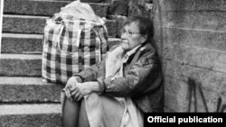 Небритый и взлохмаченный Вестербака также сидит, привалившись к стене, на листе картона. Рядом с ним лежит собака – породистая, но такая же грустная, как ее хозяин. Рядом стоит чемодан с вещами.