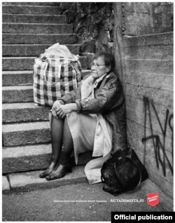 Халонен сидит в потрепанной одежде на ступеньках лестницы, закутавшись в зимний пуховик. Рядом с ней стоит клеенчатая сумка с вещами. Стены грязной лестницы, на которой сидит женщина, покрыты граффити, а на лице Халонен написаны депрессия и неверие в будущее.