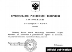 Премьер-министр России Дмитрий Медведев поручил Минфину внести кандидатуру бывшего главы ФТС Андрея Бельянинова на должность председателя правления Евразийского банка развития (ЕАБР). Распоряжение опубликовано в среду на портале правовой информации.