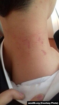 На фотографиях, отправленных в редакцию Радио Озодлик, на шее Билолбека видны следы кровоподтеков. Мальчик утверждает, что это следы побоев, нанесенных ему учителем истории.