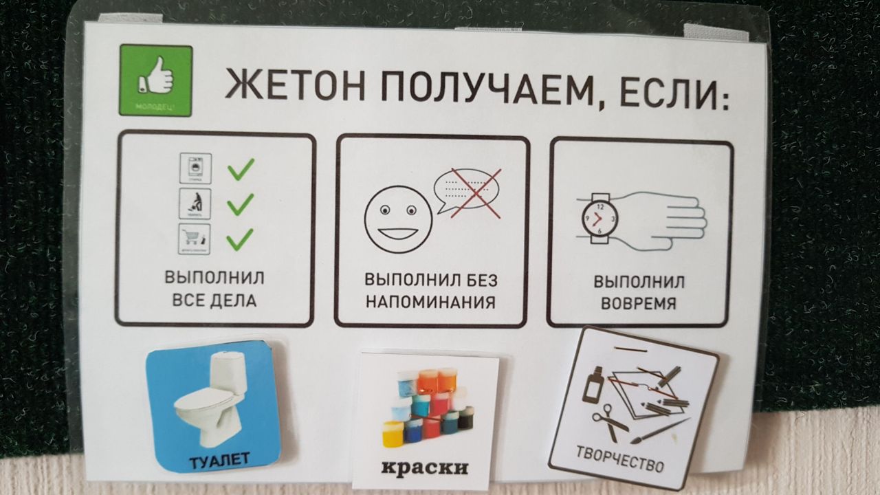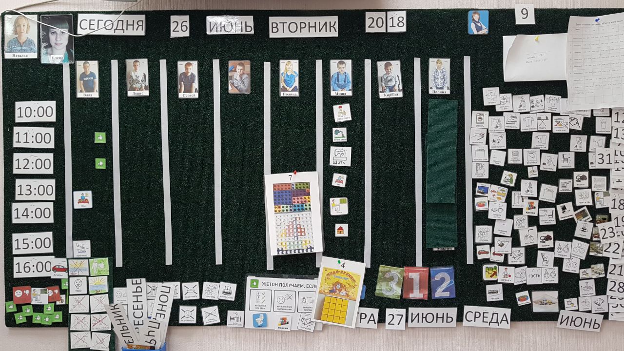 Учебный класс для взрослой группы похож на гостиную, объединенную с кухней. Здесь есть холодильник, полный еды, плита, раковина, кухонный стол. На каждом предмете – значок с его названием и схематичным изображением. Возле входа – классная доска, где из похожих карточек с действиями выстраивается расписание воспитанников. Например, напротив фотографии Влада и времени "11 00" весит значок с пылесосом. Картинки на предметах помогают ученикам ориентироваться в пространстве. С помощью расписания они учатся планировать и последовательно совершать действия.