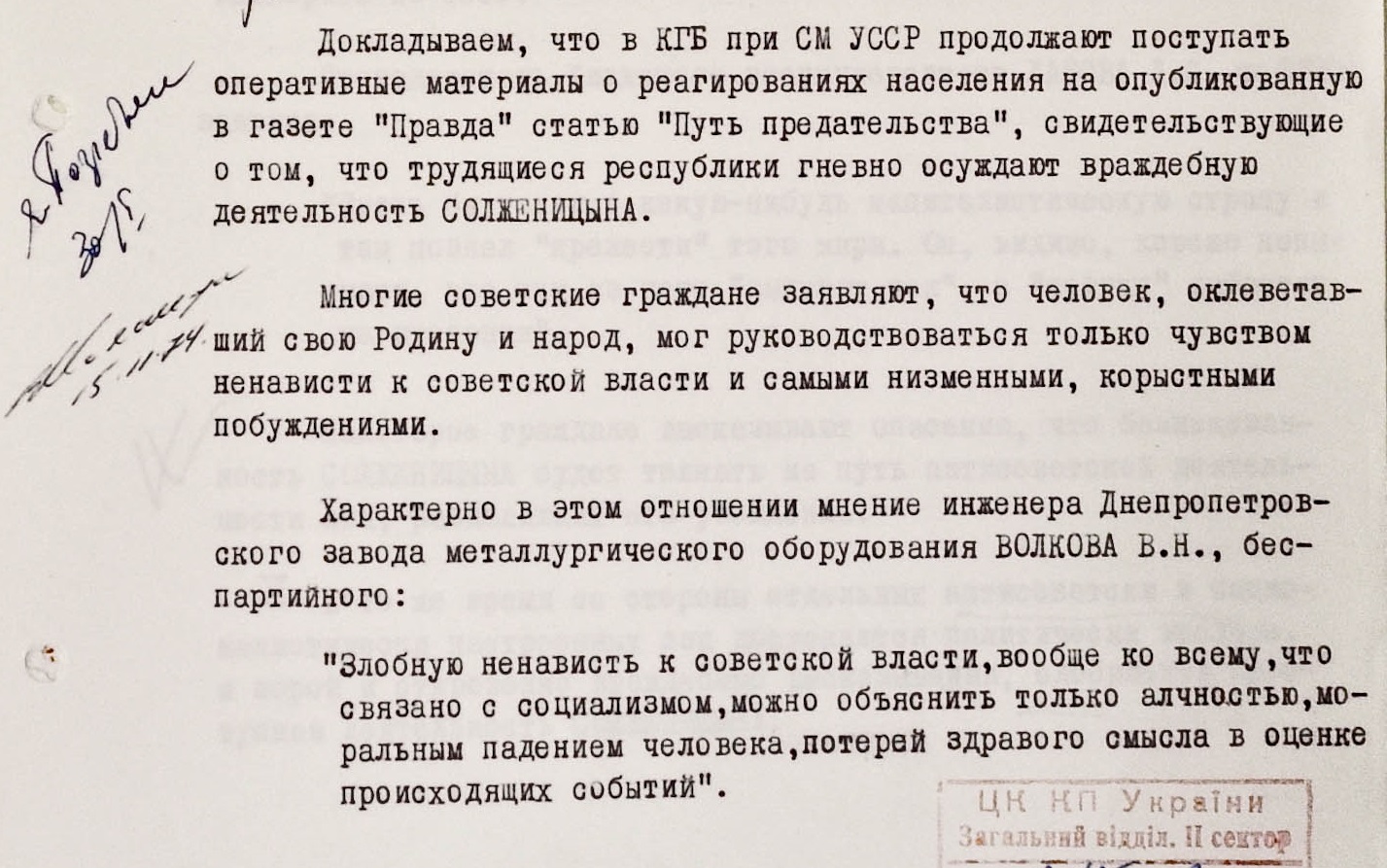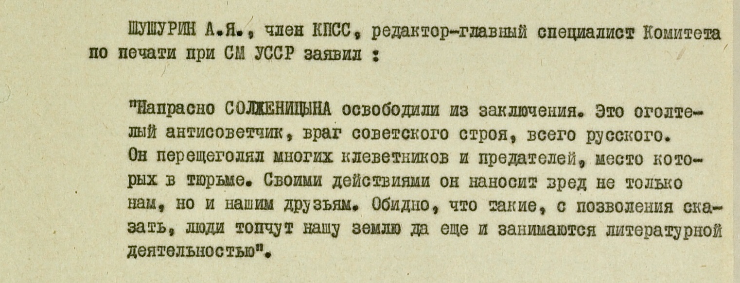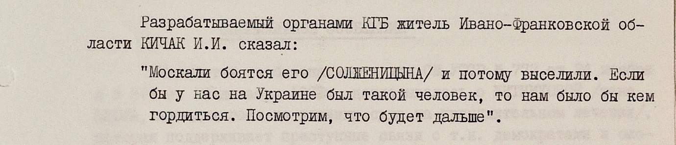 “КГБ при СМ УССР принимает меры для использования отрицательного отношения украинской эмиграции к Солженицыну в интересах нашего государства”, – сообщалось в одной из записок.