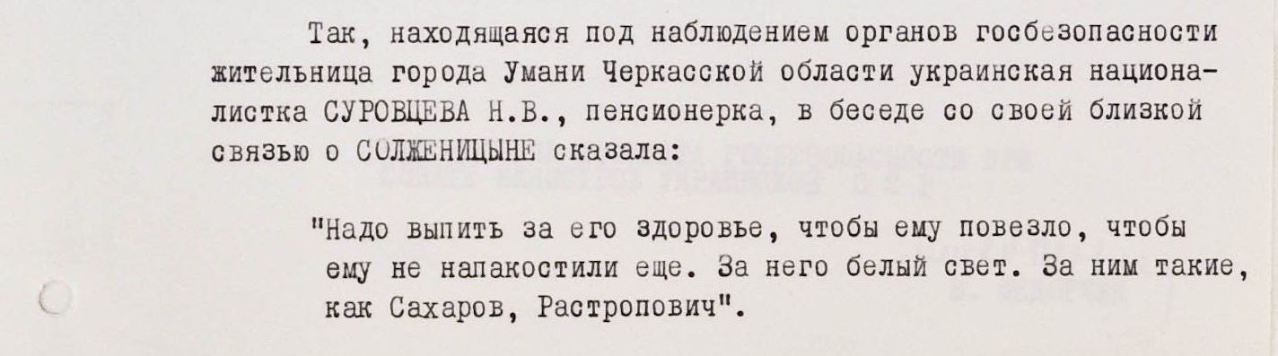 “Надо выпить за его (Солженицына – ред.) здоровье, чтобы ему повезло, чтобы ему не напакостили еще. За него белый свет. За ним такие, как Сахаров, Ростропович”, – призывала кого-то из близких пенсионерка из Умани Надежда Суровцева (чаще встречается другой вариант написания фамилии - Суровцова).