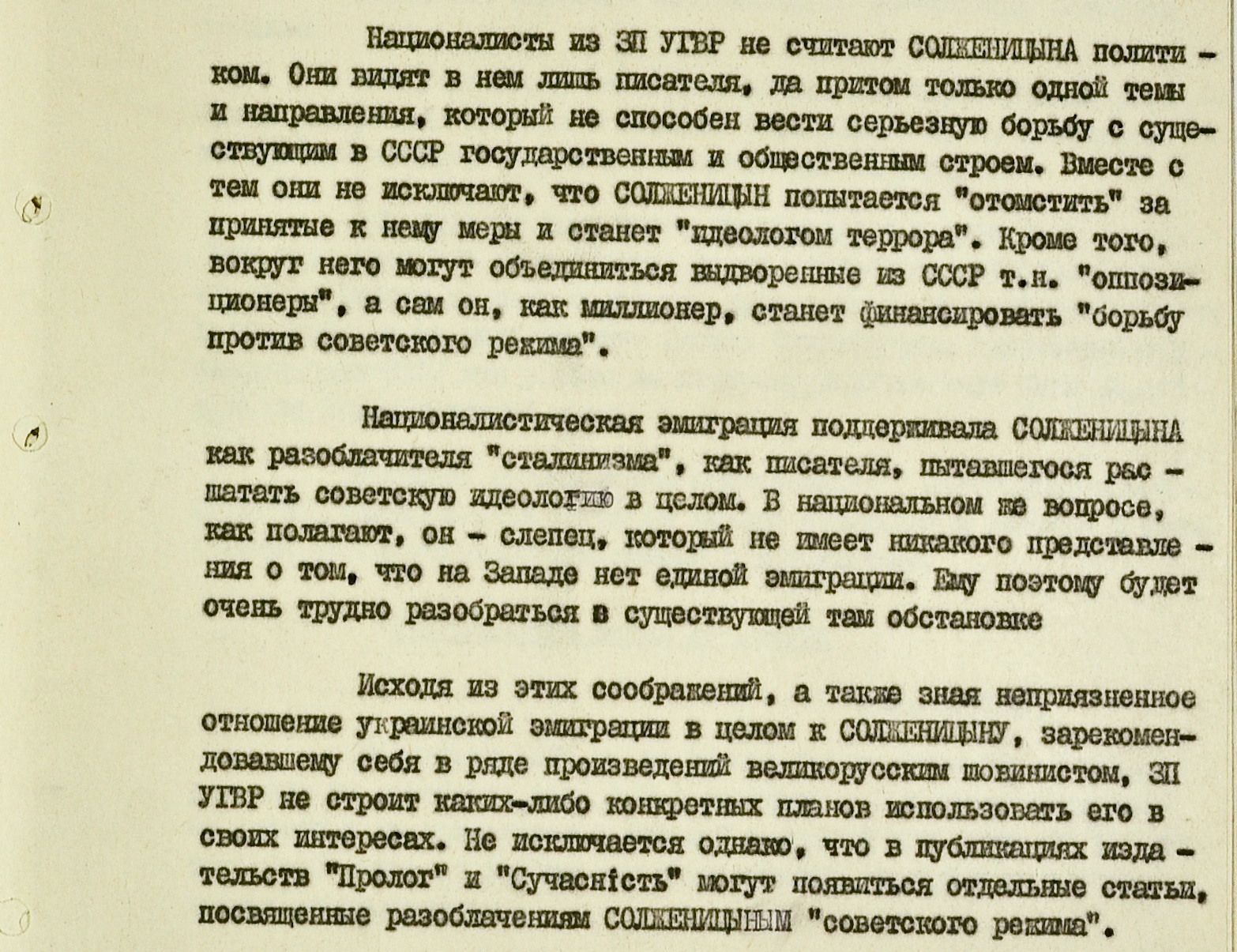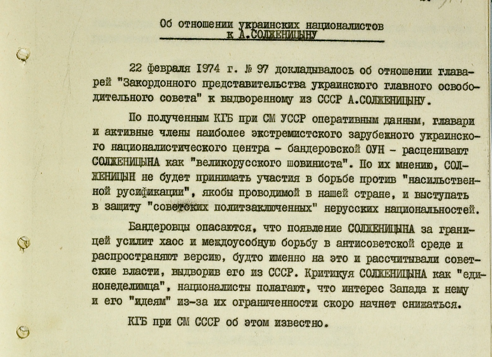 “По их (представителей “бандеровской” ОУН – ред.) мнению, Солженицын не будет принимать участия в борьбе против “насильственной русификации”, якобы проводимой в нашей стране, и выступать в защиту “советских политзаключенных” нерусских национальностей”. Бандеровцы опасаются, что появление Солженицына усилит хаос и междоусобную борьбу в антисоветской среде и распространяют версию, будто именно на это и рассчитывали советские власти, выдворив его из СССР”, – отмечали в спецслужбе.