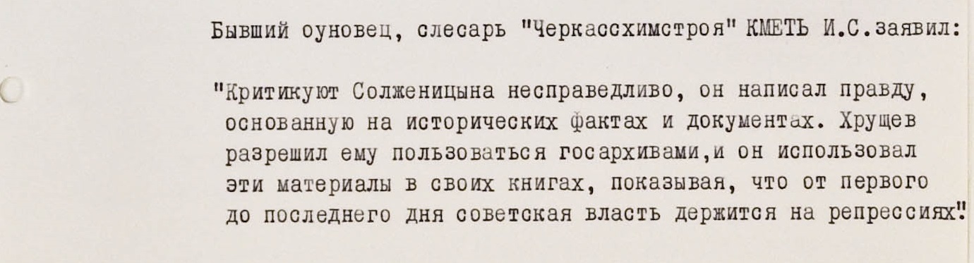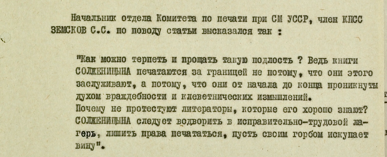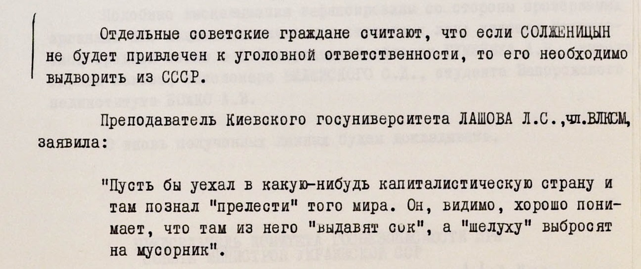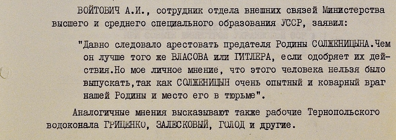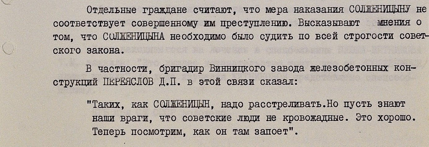 “Таких, как Солженицын, надо расстреливать. Но пусть знают враги, что советские люди не кровожадные. Это хорошо. Теперь посмотрим, как он там запоет”, – рассуждал бригадир Винницкого завода железобетонных конструкций Д. Переяслов.