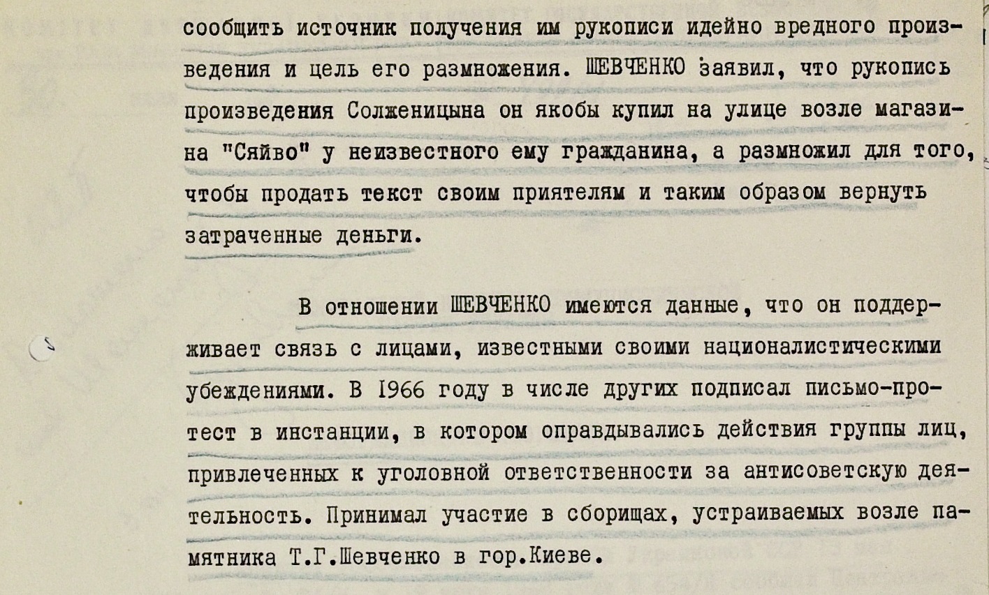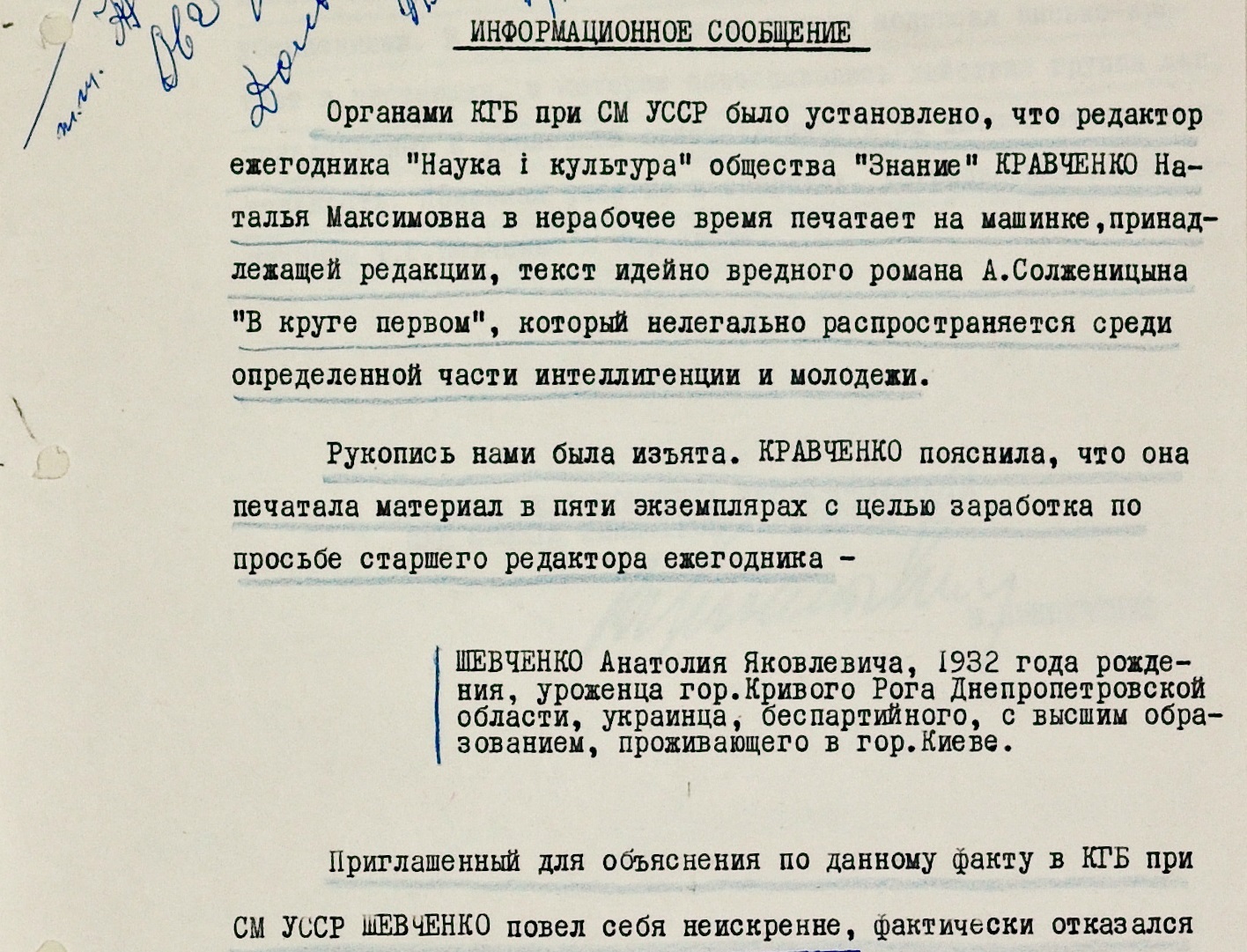 В 1969 году на выпуске самиздата попалась редактор ежегодника “Наука і культура” киевлянка Наталья Кравченко. В нерабочее время она набирала на редакционной печатной машинке текст “идейно вредного романа А. Солженицына “В круге первом”, который нелегально распространялся среди определенной части интеллигенции и молодежи”. Рукопись изъяли, женщину допросили. Она заявила, что готовила пять копий книги. Цель – заработать на их продаже. А организовал все, по словам Кравченко, старший редактор Анатолий Шевченко.