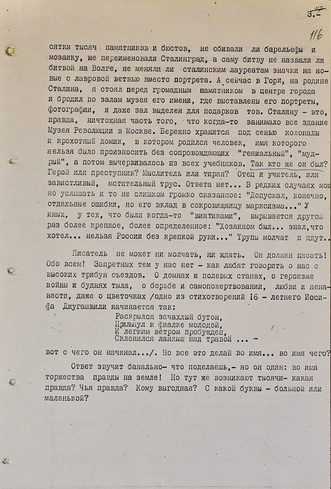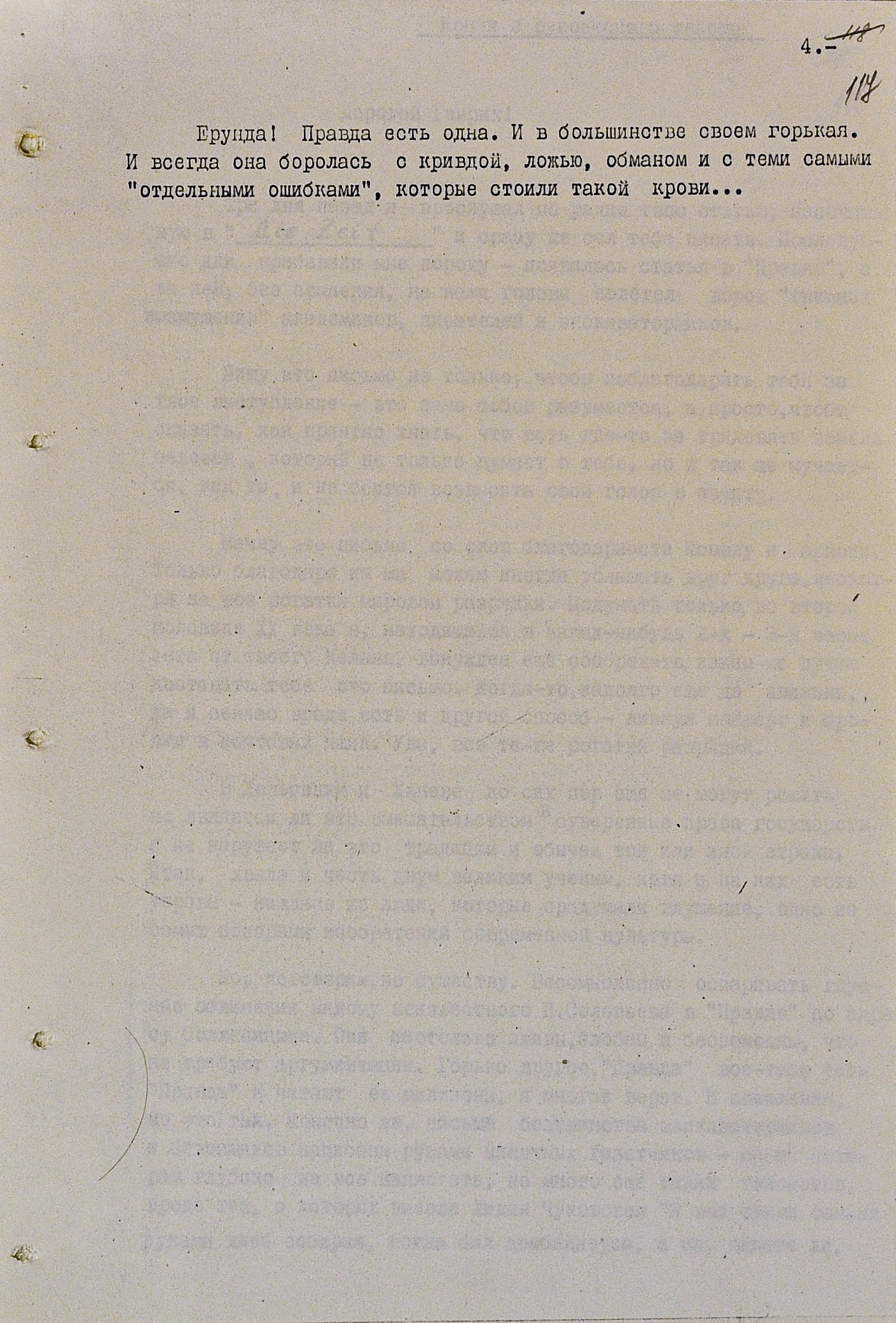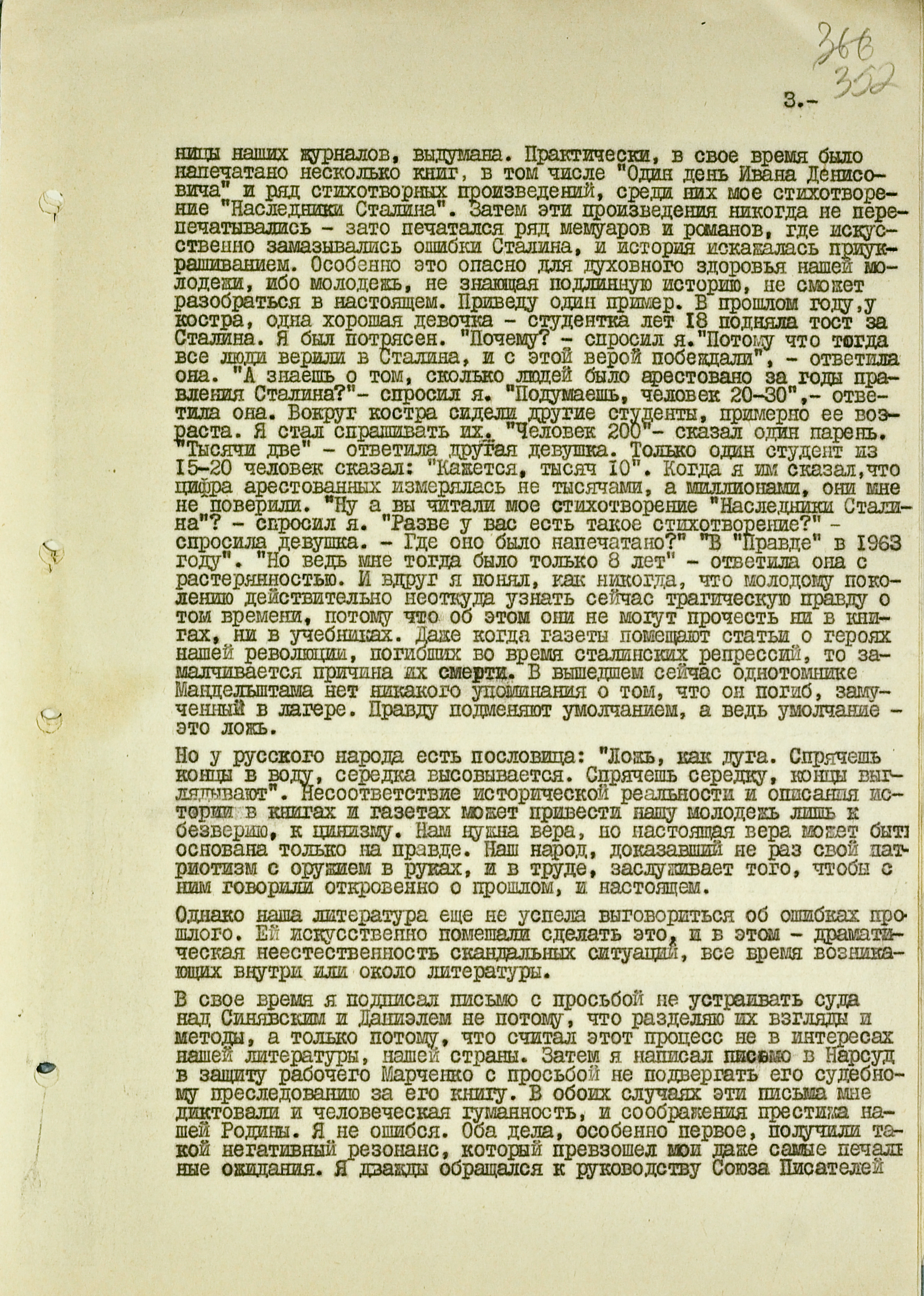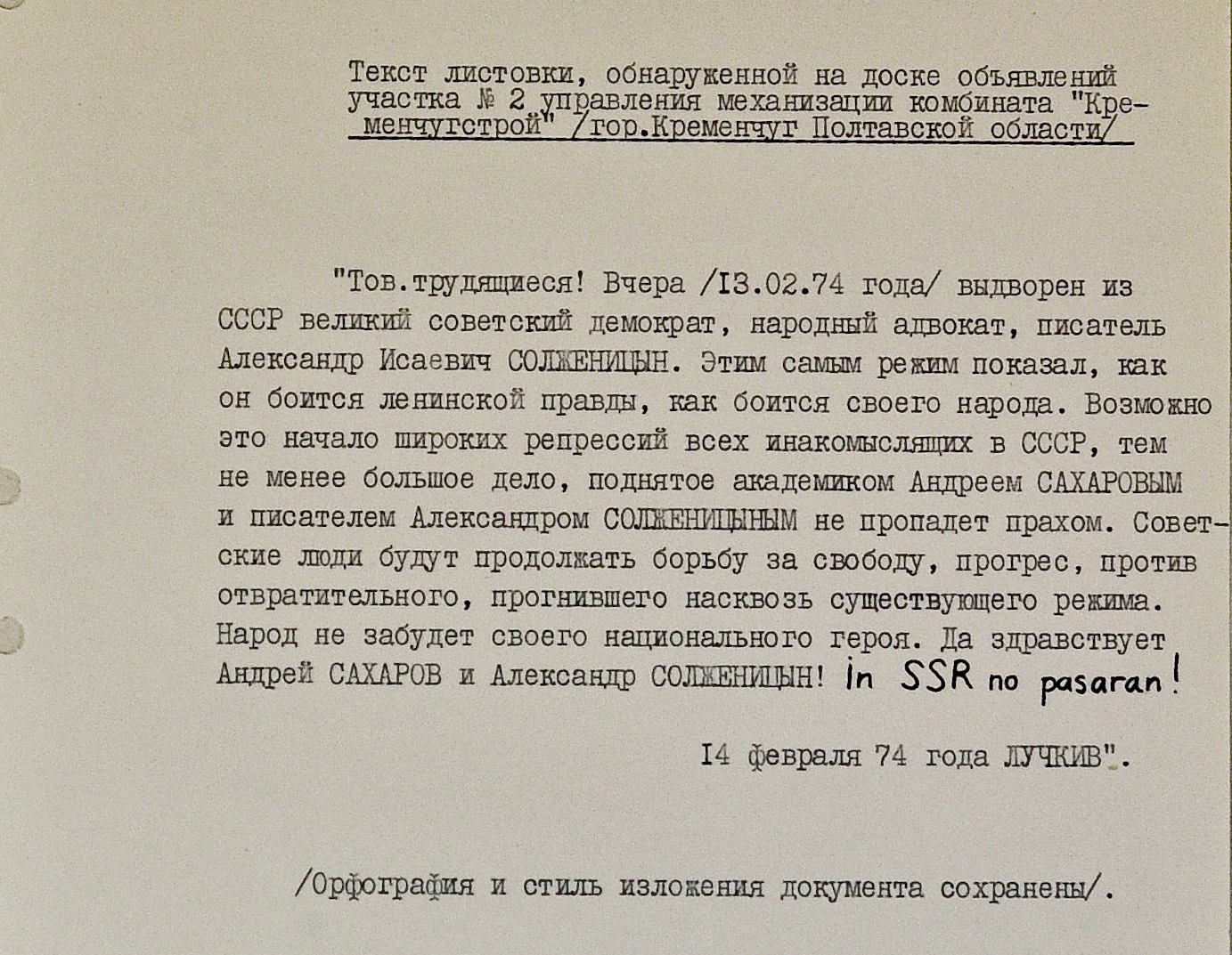 В листовке, которую кто-то повесил на доску объявлений комбината в Кременчуге, Солженицына называют “великим советским демократом” и “народным адвокатом”. Автор заявляет, что несмотря на репрессии, люди будут продолжать дело Солженицына и Сахарова – “борьбу за свободу, прогресс, против отвратительного, прогнившего насквозь существующего режима”.