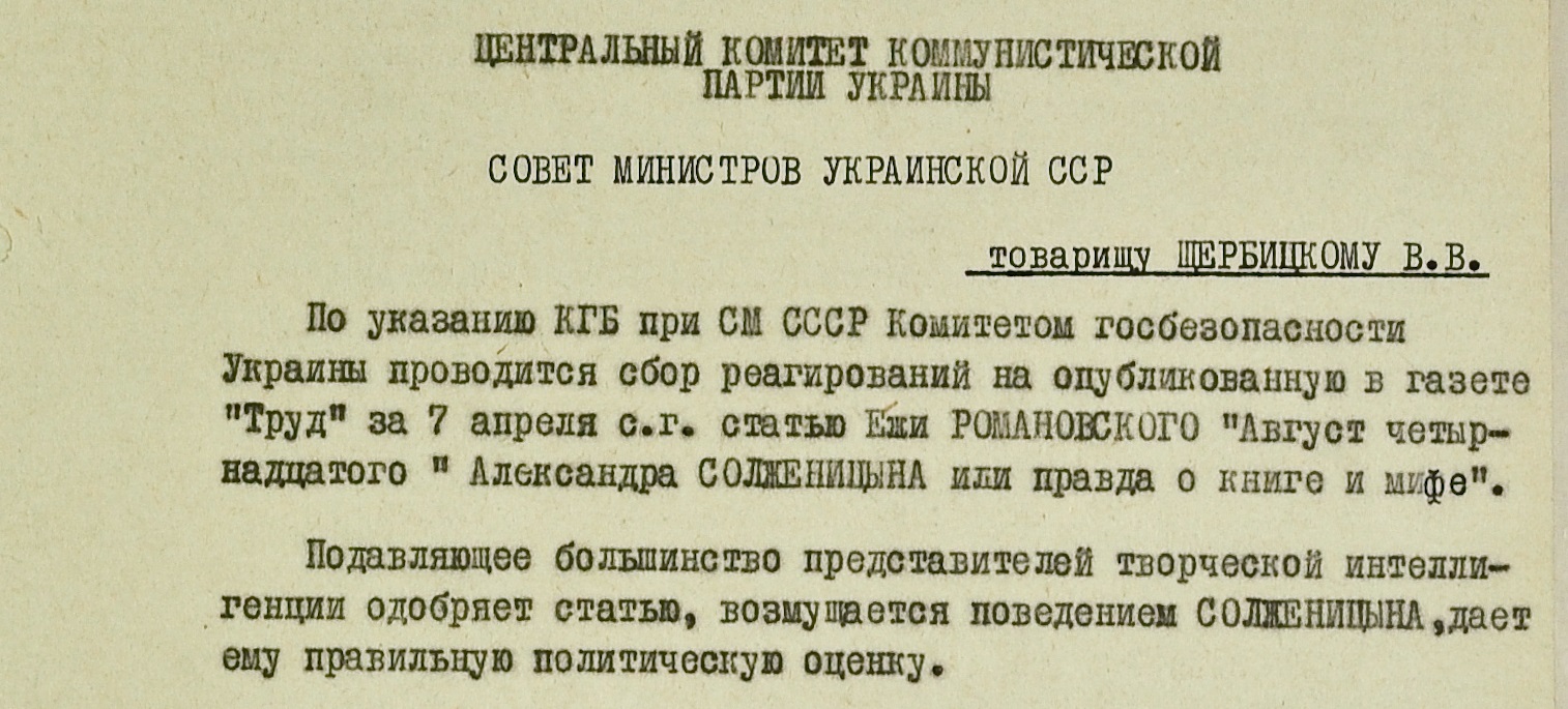 В апреле 1972 года газета “Труд” опубликовала переведенную с польского разгромную рецензию Ежи Романовского на недавно вышедший роман Солженицына “Август Четырнадцатого”. Через несколько дней “комитетчики” рапортовали: “Подавляющее большинство представителей творческой интеллигенции одобряет статью, возмущается поведением Солженицына, дает ему правильную политическую оценку”.