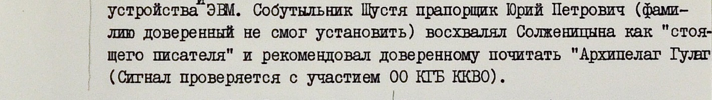 Фамилию живущего в США диссидента и названия его книг можно встретить даже в таких документах, как составленная в 1979 году записка Комитета госбезопасности о “нездоровой обстановке” в киевских ресторанах. До ушей доверенного лица чекистов дошли слова сидящего за столиком подвыпившего военного, который хвалил Солженицына и советовал почитать “Архипелаг ГУЛАГ”.
