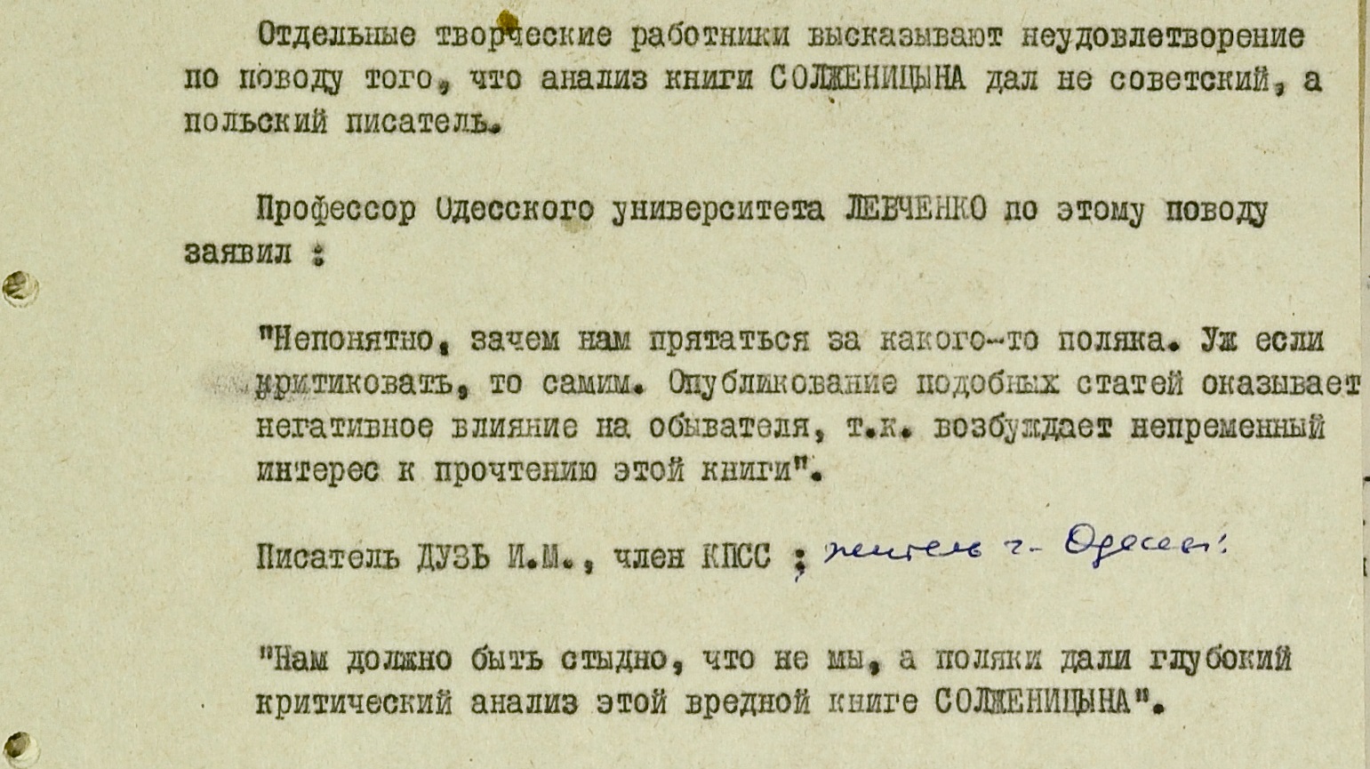 “Кухонными” разговорами поддержка Солженицына не ограничивалась. После его выдворения в некоторых украинских городах обнаружились самодельные листовки в защиту писателя. Некоторые из них попадали в КГБ и тоже сохранились в архиве.