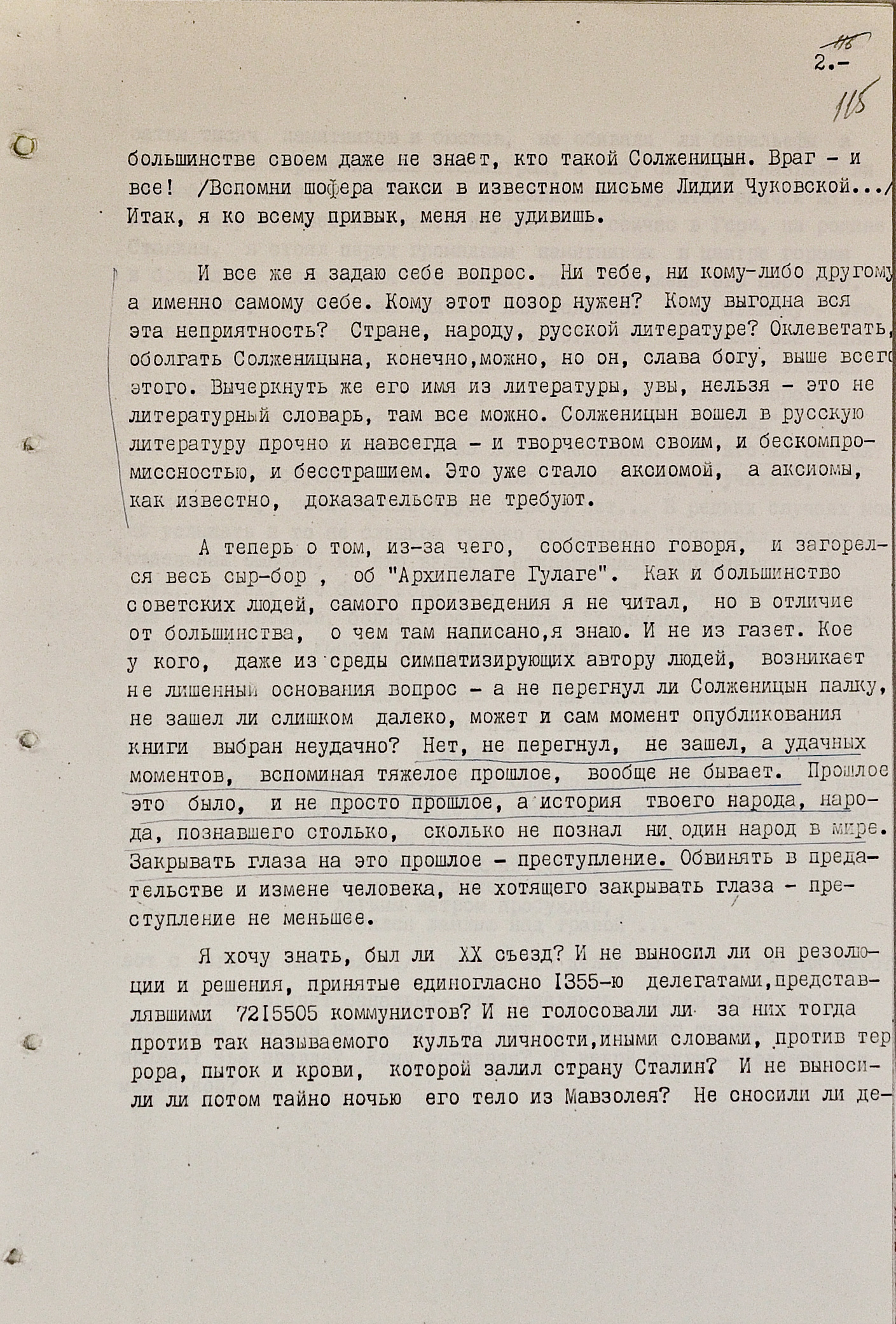 Отдельная тема – “клевета Солженицына на героических защитников Сталинграда, восхваление им лиц, ставших на путь сотрудничества с гитлеровцами”. В документах приводится несколько отзывов возмущенных фронтовиков.