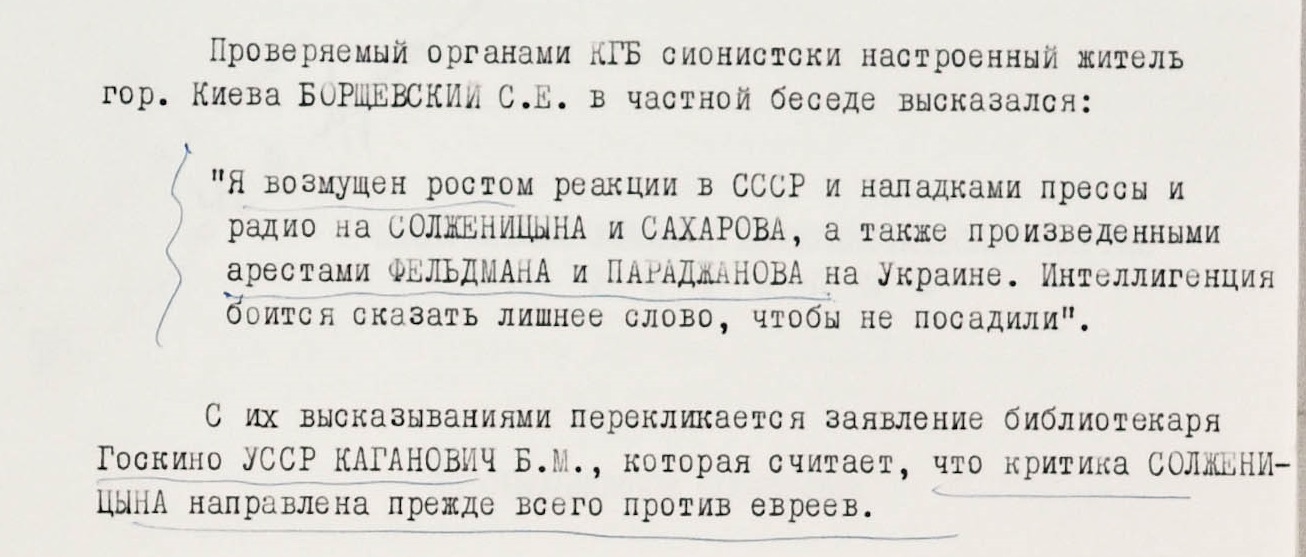 Киевлянин С. Борщевский в частной беседе выступал против травли Солженицына и Андрея Сахарова, а также арестов режиссера Сергея Параджанова и активиста сионистского движения Александра Фельдмана.