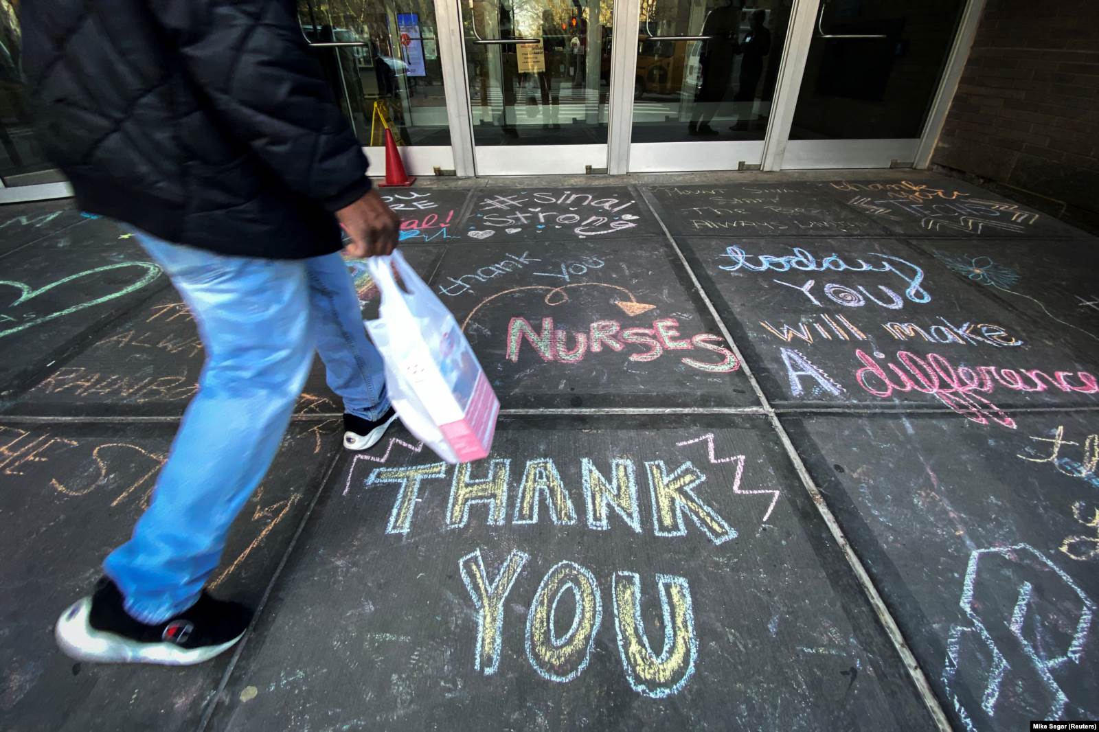 Благодарности медикам, оставленные у входа в больницу в Нью-Йорке, 7 апреля 2020 года. Фото: Reuters
