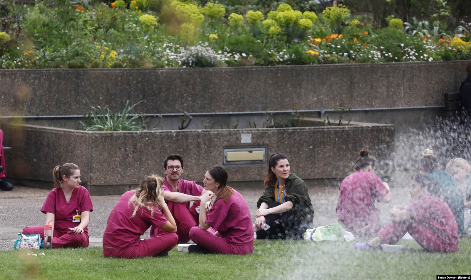 Медики отдыхают на лужайке возле больницы St Thomas' в Лондоне, Великобритания. 8 апреля 2020 года. Фото: Reuters