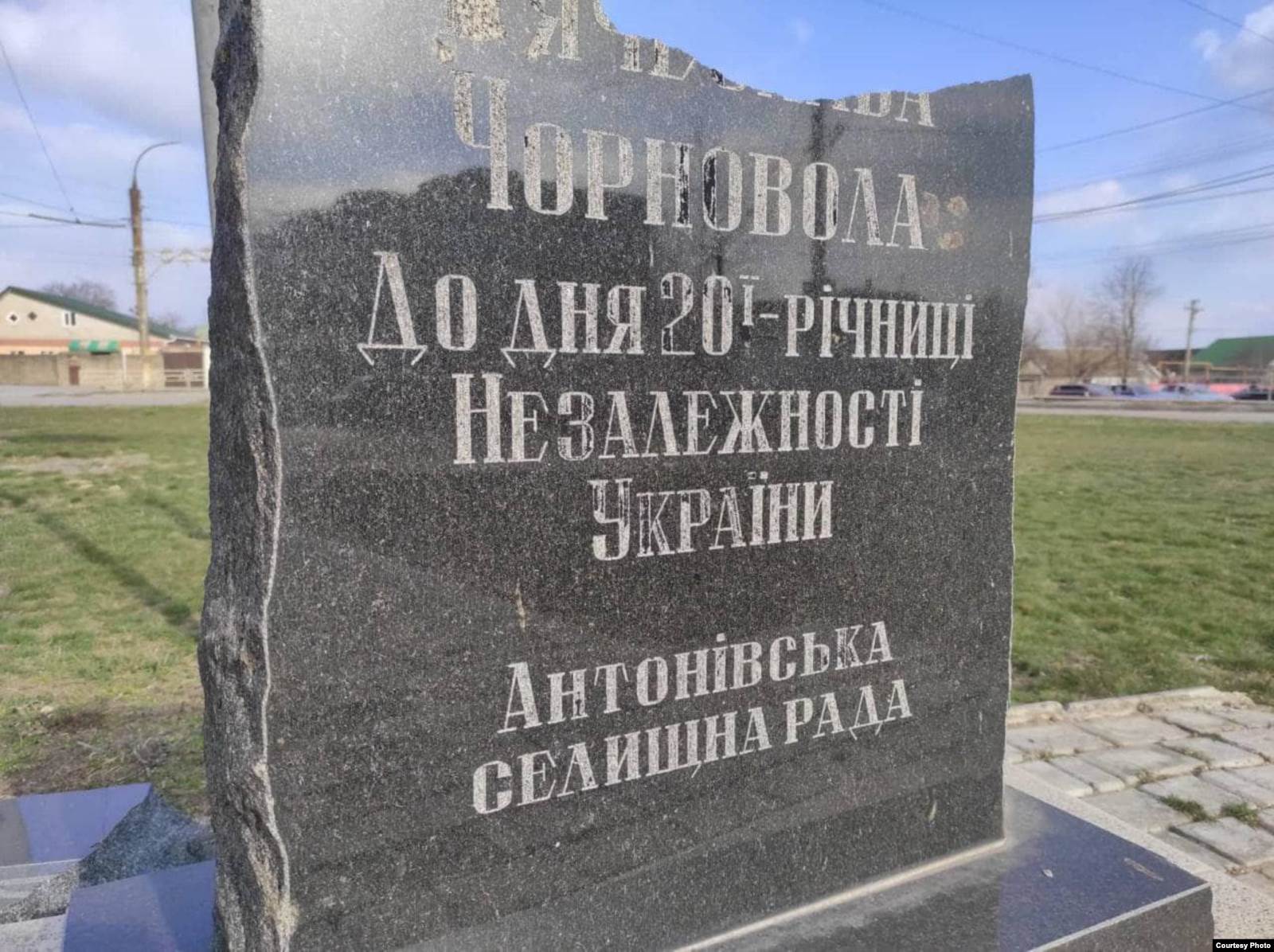 Разрушенный оккупационными войсками памятный знак в честь Вячеслава Черновола, Антоновка. Фото: Верховная Рада Украины