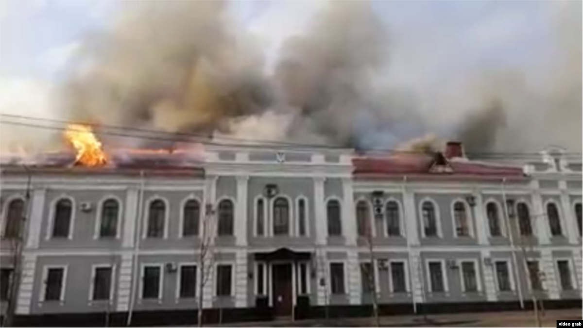 Горящее здание СБУ в Чернигове, 25 февраля 2022 года. Фото: "Суспільне Чернігів"