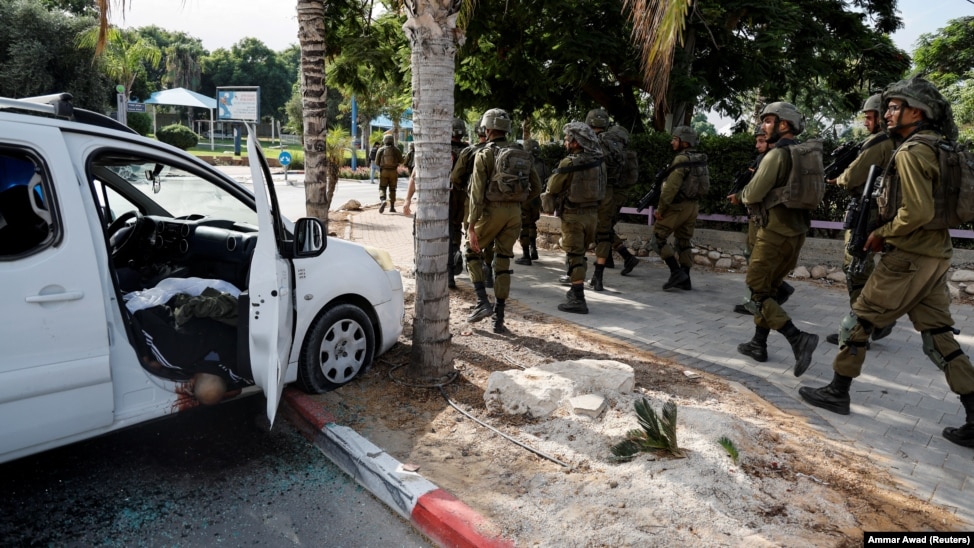 Израильские солдаты проходят мимо погибшего в в Сдероте, на юге Израиля, во время массового проникновения боевиков ХАМАС из сектора Газа на территорию Израиля 7 октября 2023 года