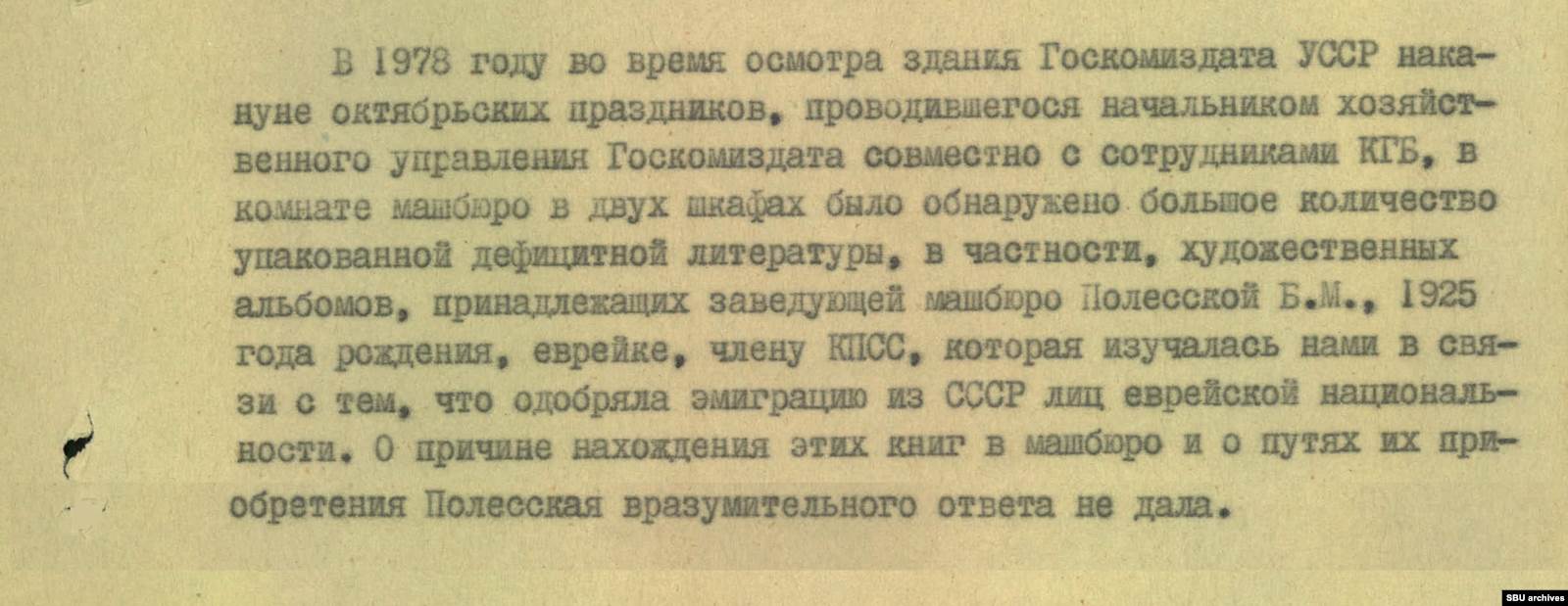 Большое количество такой литературы, в том числе художественных альбомов, нашли сотрудники КГБ во время осмотра здания Госкомиздата УССР в 1978 году. Упаковки с дефицитом лежали в двух шкафах в помещении машинописного бюро. Владельцем оказалась заведующая бюро Б. Полесская. КГБ уже «изучал» ее раньше — женщина одобряла эмиграцию евреев из СССР.