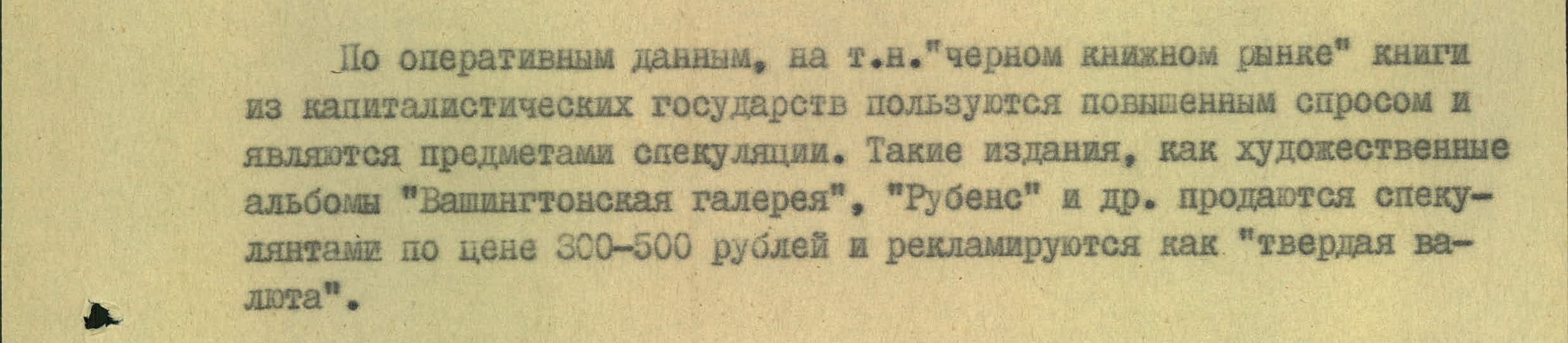 Привезенные с Запада книги пользовались немалым спросом на советском черном рынке. Особенно ценились хорошо иллюстрированные альбомы с картинами — КГБ в качестве примера приводит издания о Рубенсе и Вашингтонской галерее.