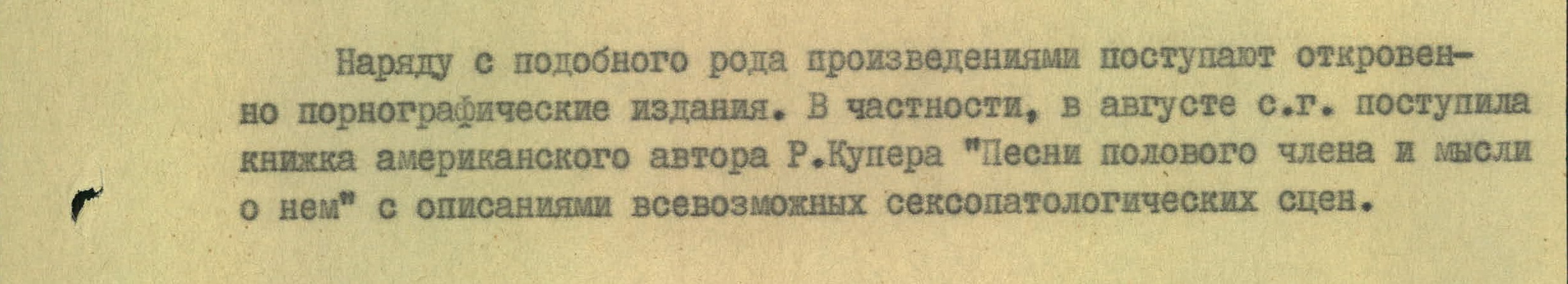 Неписаное правило «в СССР секса нет» распространялось, конечно же, и на книги. Литература для взрослых все же попадала в страну, в том числе в ходе книгообмена. КГБ в качестве примера приводит работу под названием «Песни полового члена и мысли о нем» некоего американца Р. Купера. В книге, как утверждается, присутствует «описание всевозможных сексопатологических сцен». Автор сообщения, вероятно, неточно выразился, и слово «сексопатологические» здесь использовано в значении «сексуальные». С помощью поисковиков и онлайн-каталогов крупнейших библиотек найти такое издание не удалось.