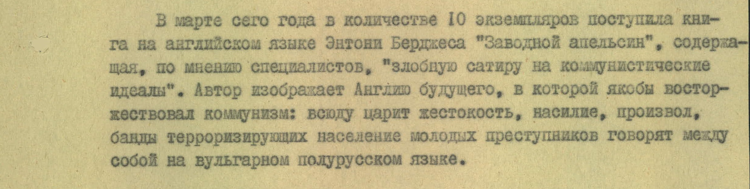 Так КГБ в своем сообщении характеризует роман Энтони Берджеса «Заводной апельсин». В Киев в 1979-м завезли десять экземпляров книги на английском.