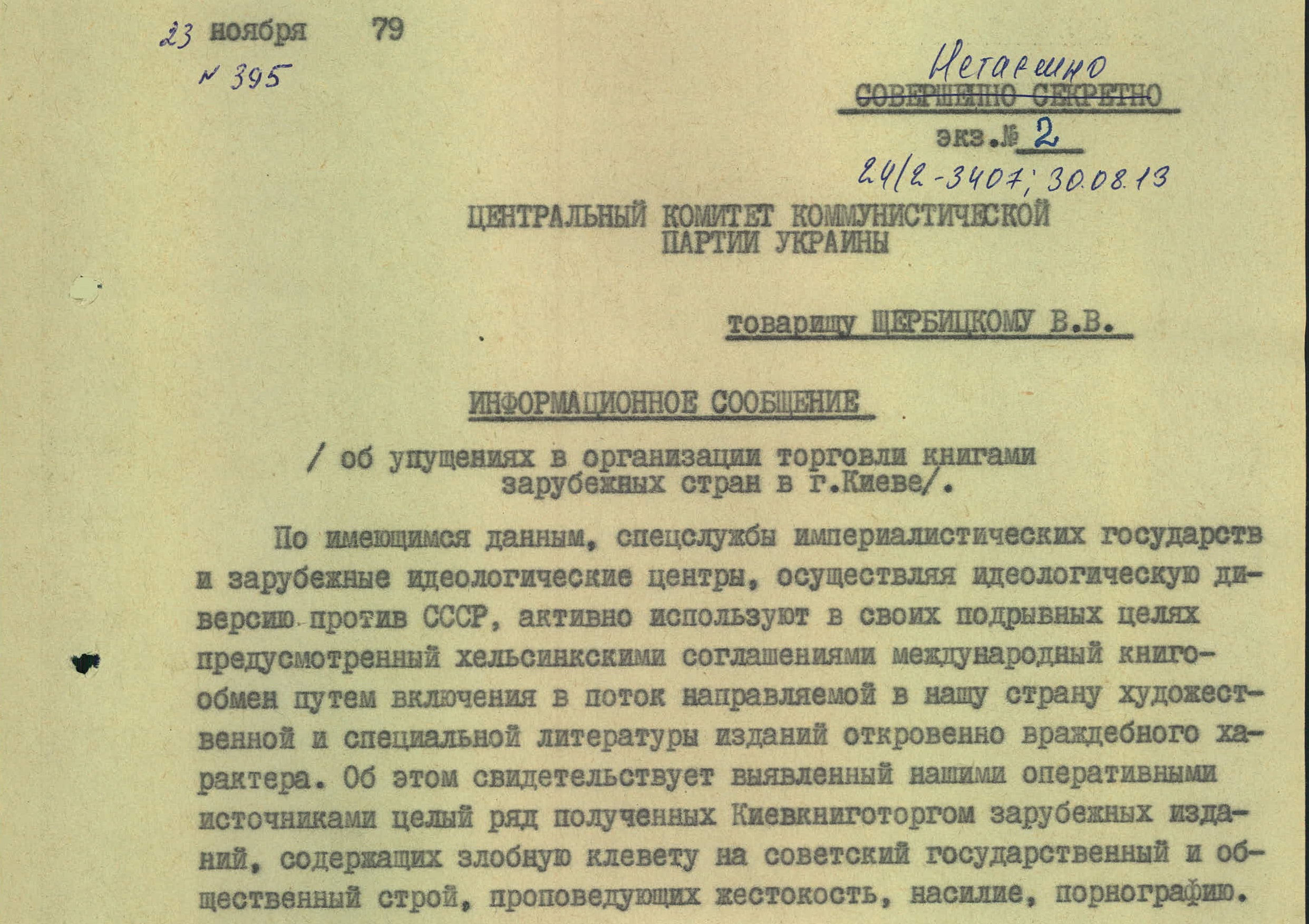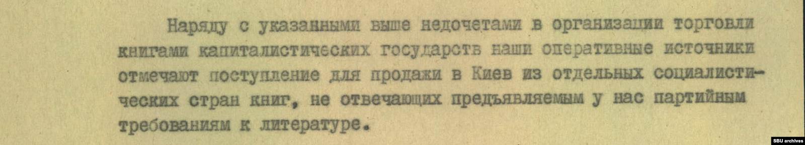 Конечно, книги попали в магазин не просто так — это была идеологическая диверсия, спланированная «спецслужбами империалистических государств и зарубежных идеологических центров», писал председатель КГБ Украинской ССР Виталий Федорчук в ноябре 1979 года главе республики Владимиру Щербицкому. Составленный им документ называется «Об упущениях в организации торговли книгами зарубежных стран в г. Киеве».