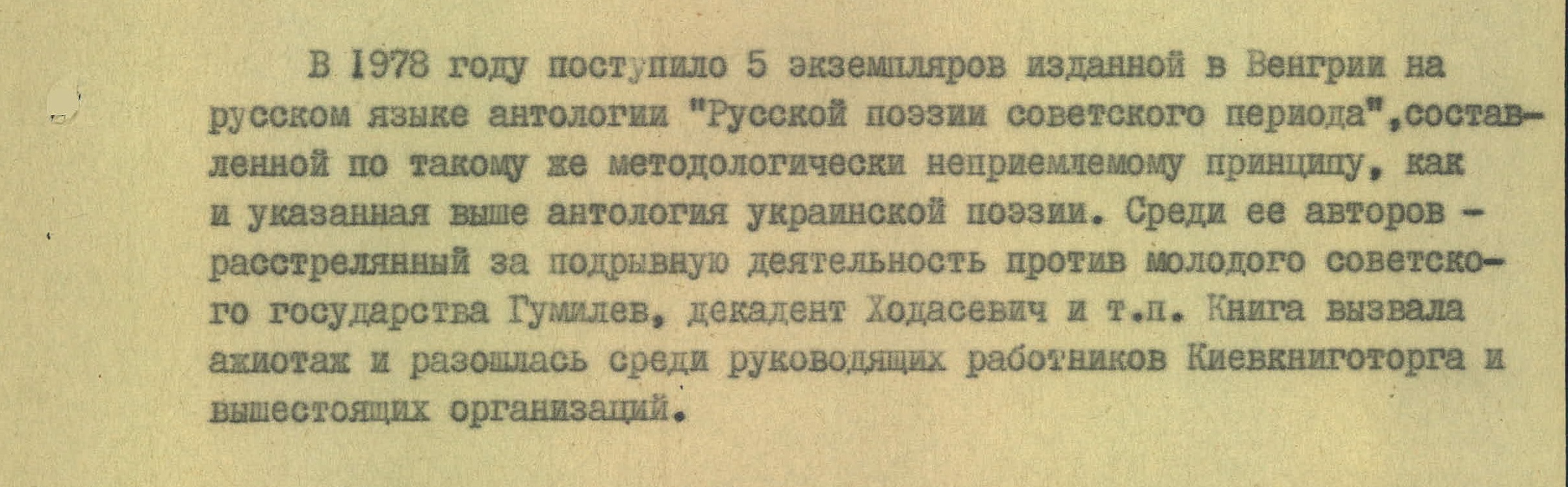«По такому же методологически неприемлемому принципу» была составлена, по мнению источника спецслужбы, и антология русской поэзии советского периода, изданная в Венгрии на русском языке. Среди авторов в сообщении выделены «расстрелянный за подрывную деятельность против молодого советского государства Гумилев, декадент Ходасевич и т.п.».