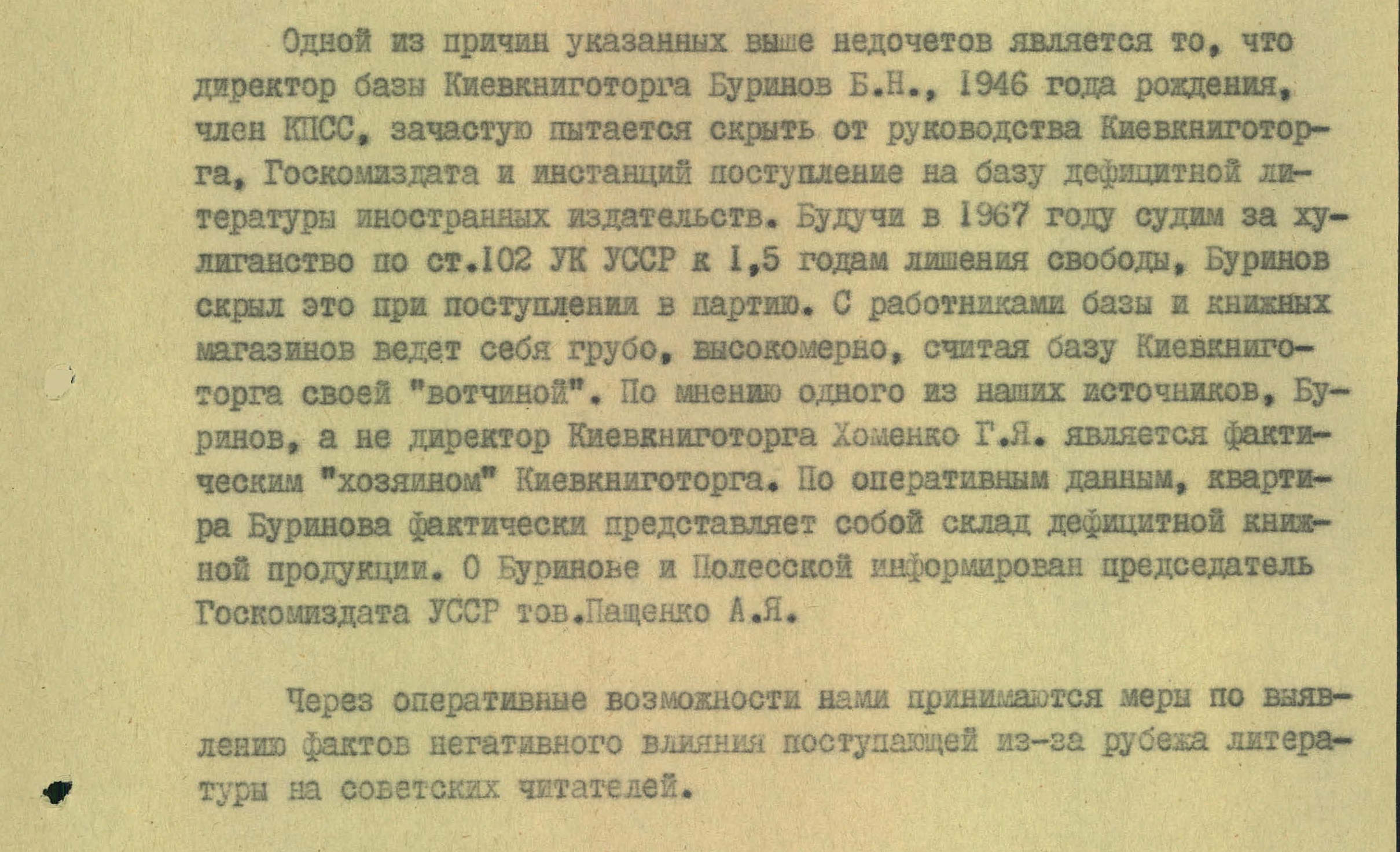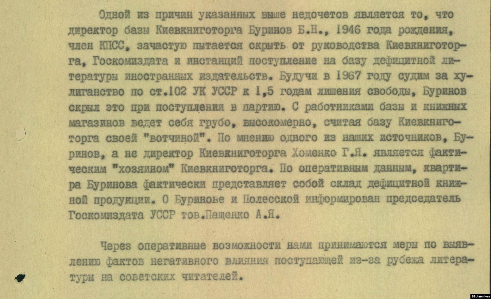 Центральной фигурой киевского черного рынка литературы спецслужба называет директора базы Киевкниготорга Б. Буринова. Он, как сообщалось, пытался скрыть от начальства поступление дефицитных импортных книг, считал базу своей собственностью и вообще был теневым хозяином всего Киевкниготорга. Квартира директора базы фактически превратилась в склад ценных изданий.
