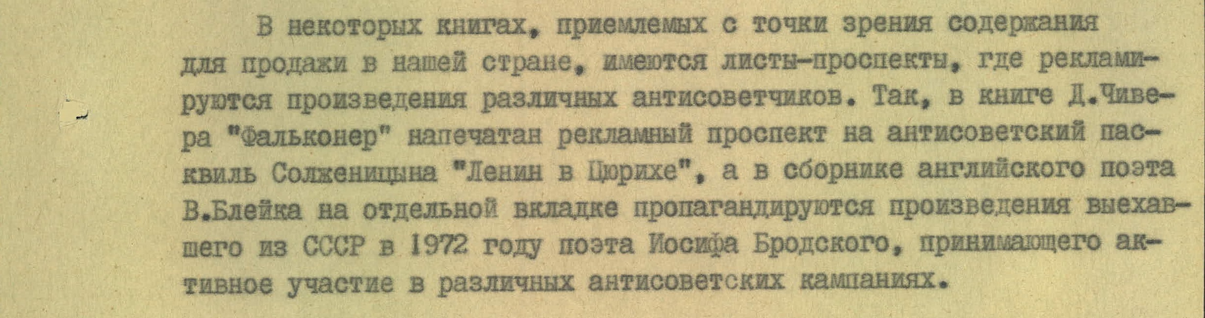 В поле зрения КГБ попадали даже книги «правильного» содержания, в которых издательства размещали рекламу «произведений различных антисоветчиков». В романе Джона Чивера нашли рекламный проспект «Ленина в Цюрихе» Александра Солженицына. А в сборнике стихов Уильяма Блейка «на отдельной вкладке пропагандировались произведения выехавшего из СССР в 1972 году поэта Иосифа Бродского, принимающего активное участие в различных антисоветских кампаниях».