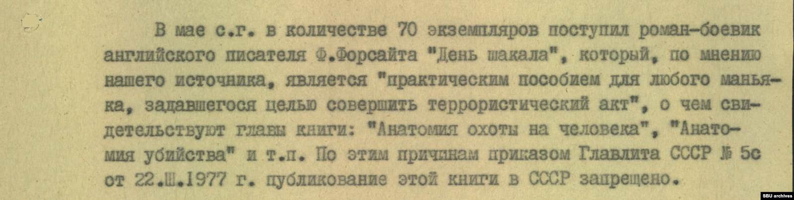 «Практическим пособием для любого маньяка, задавшегося целью совершить террористический акт», спецслужба назвала — со ссылкой на свой источник — роман «День Шакала».