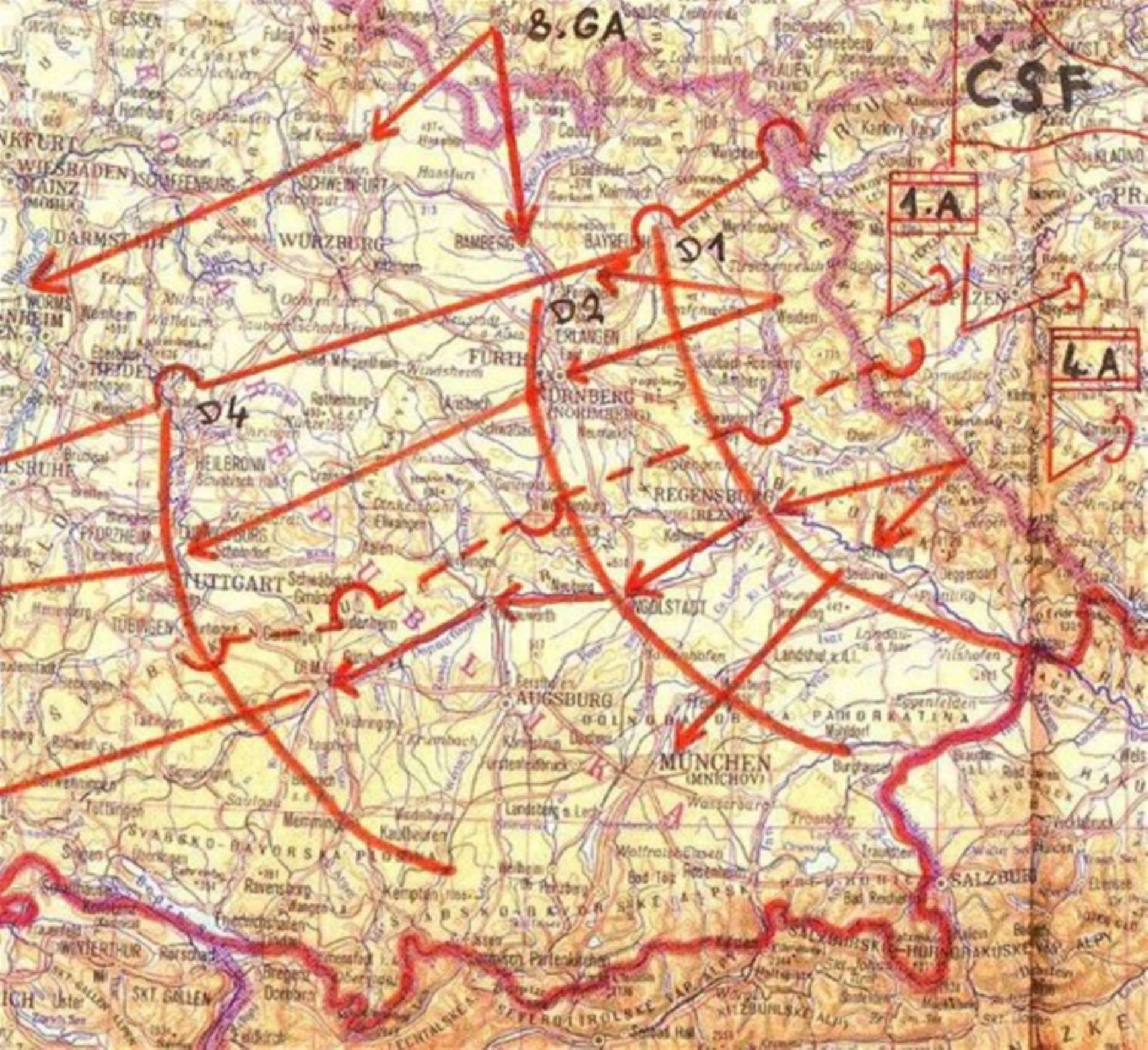 Союзной армии предписывалось при поддержке ударов ядерного оружия в кратчайшие сроки занять Баварию и выйти к Рейну, где проходила граница Западной Германии и Франции.