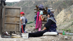 До своего участка Забихат добирается по горной тропе за 15-20 минут вместе со свекровью и детьми: "Когда они могут ходить, где-то с четырех годиков, дороги же опасные, поэтому ранний возраст туда не берем. Там они мне все помогают выкапывать эти коробки, относить песок, тащат воду, которая из источника, они во всем помогают. Когда они бывают, легче работа дается, быстрее заканчивается".