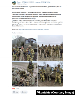В середине января в социальной сети "ВКонтакте" от имени профиля "Газета "Спецназ России" и журнал "Разведчикъ" были опубликованы фотографии, на которых якобы запечатлены сербы, прибывшие в Запорожскую область Украины из Белграда. В посте утверждалось, что они входят в состав добровольческого батальона имени Павла Судоплатова. Он был создан, предположительно, осенью 2022 года в оккупированной Россией части Запорожской области и назван в честь сотрудника советских спецслужб, диверсанта, сотрудника ОГПУ-НКВД и организатора убийства Льва Троцкого. Приводятся также слова назначенного Россией "главы" частично оккупированной Запорожской области Украины Евгения Балицкого: он заявил, что "братья-сербы" не словом, а делом продемонстрировали свою верность России и готовы "сражаться с нацизмом" в Украине.
