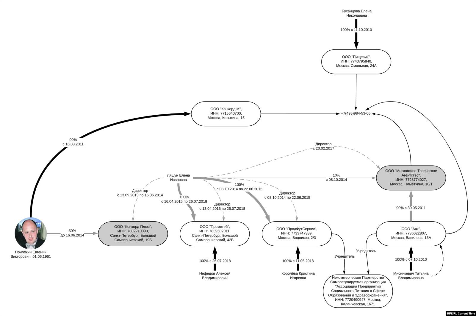 Подсчет велся по компаниям, чья принадлежность к империи Пригожина была подтверждена расследованиями BBC, РБК, ФБК, Фонтанки и Настоящего Времени: «Московский школьник», «Экобалт», «Школьник-ЮЗ», «Спецресурс», «СПб-Кулинария», «Социальное питание "Центр"», «РесторанСервис Плюс», «ПродФудСервис», «Пищевик», «Меркурий», «Компонент», АСП, ТКС, «Теплоснаб», «Еврогрупп», «Теплосинтез», «ПрофТехУслуги», «Прометей», «Общепит», «НордЭнерго», «Мск», «Московская кулинария», «Конкорд Плюс», «Конкорд менеджмент и консалтинг», «Конкорд М», «КДП-Кетеринг», АВК, «МедСтрой», «Комбинат дошкольного питания» и «Вито-1».